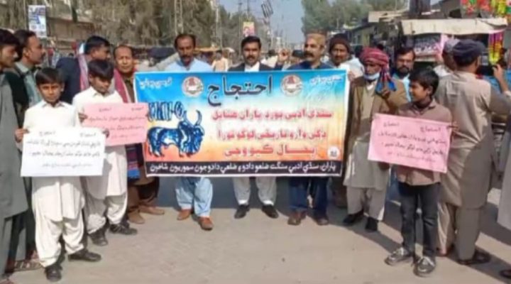 دادو: سنڌي ادبي بورڊ پاران هٽايل ڍڳي واري لوگي جي بحالي لاءِ احتجاجي مظاهرو