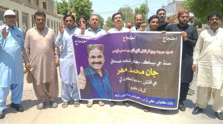 نوابشاھ (بيورو رپورٽ) جوائنٽ ايڪشن ڪميٽي جي سڏ تي شهيد جان محمد مھر جا قاتل گرفتار نه ٿيڻ خلاف نوابشاھ جي صحافين نوابشاهه پريس ڪلب آڏو احتجاجي مظاهرو ڪيو جتي اڳواڻن اڪرم چانڊيو اسماعيل ڊومڪي منظور سومرو حبيب الله ابڙو آصف البشر عبدالفتاح رند ، فدا حسين رند ۽ ڪئميرا مين اڳواڻ شعبان خاصخيلي مشرف ڀٽي اعظم ڀٽي دائود شاھ عبيد الله قربان خاصخيلي وحيد کوسو ۽