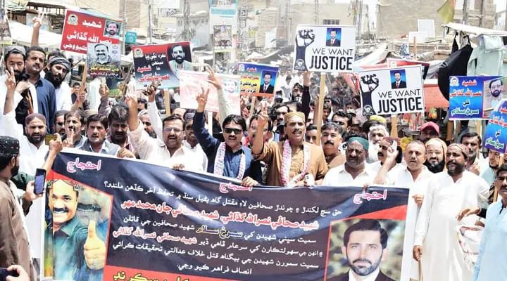 سڪرنڊ: شهيد صحافي نصر الله گڏاڻيءَ جي قاتلن جي گرفتاريءَ لاءِ نيشنل پريس ڪلب پاران احتجاجي ريلي