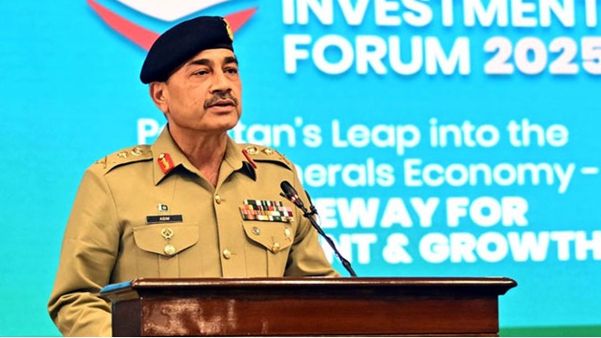 اسلام آباد ۾ پاڪستان منرل انويسٽمينٽ فورم 2025ع کي خطاب ڪندي آرمي چيف جنرل عاصم منير چيو ته اسان عالمي ادارن کي ڀليڪار چئون ٿا، سيڙپڪار موقعا ڳولن ۽ وسلين جي صلاحيت جي ترقيءَ ۾ اسان سان ڀائيواري قائم ڪن.