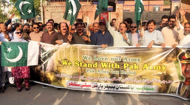 سکر ( رپورٽ: امداد گل ڪلوڙ) پاڪستان پيپلز پارٽي سٽي سکر پاران ڀارتي جارحيت خلاف سخت احتجاجي مظاهرو ڪيو ويو، جيڪو سکر پريس ڪلب جي سامهون منعقد ٿيو. ان مظاهري ۾ وڏي تعداد ۾ ڪارڪنن، شهرين ۽ مقامي اڳواڻن شرڪت ڪئي. احتجاج جو مقصد ڀارت جي تازي اشتعال انگيزين جي سخت لفظن ۾ مذمت ڪرڻ ۽ پاڪ فوج سان مڪمل يڪجهتي جو اظهار ڪرڻ هو.