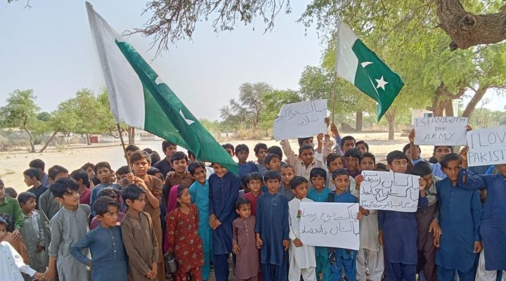 مٺي(ڊ-ر)ننگرپارڪر لڳ ڳوٺ رڻپاريو ۾ ڳوٺاڻن استادن ۽ شاگردن پاڪستاني جھنڊا ۽ پلي ڪارڊ کڻي پاڪ فوج جي
