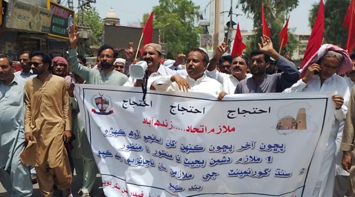 سکر ۾ آل پاڪستان لوڪل گورنمينٽ ورڪرز فيڊريشن جي ريلي ۽ ڌرڻو، ملازم دشمن بجيٽ خلاف احتجاج، پگهار ۽ پينشن ۾ واڌ جو مطالبو